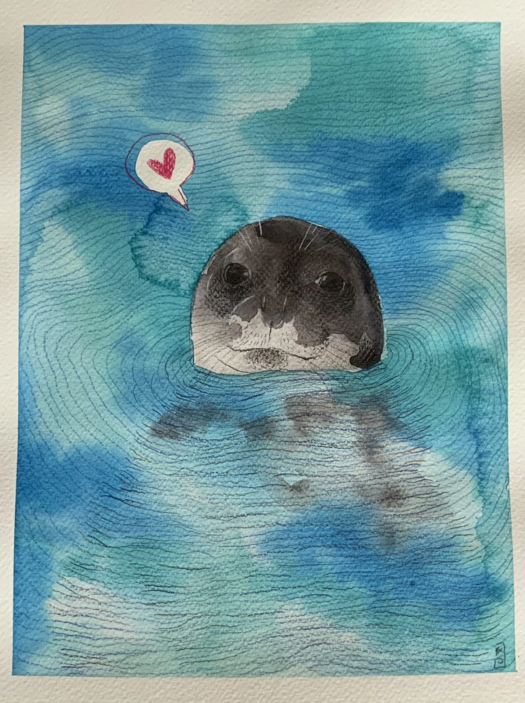 Featured artist Hélène Kowalski submitted her watercolor with pencil art of the Mediterranean Monk Seal.